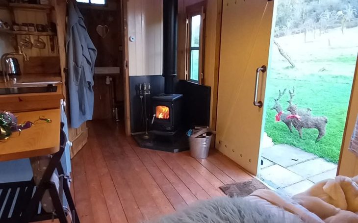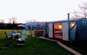 Looking for a little bit more of luxury then go for our 1930’s Converted Railway Wagon, it has a wood burning stove & wood fired hot tub, sleeps 2 people in a double bed with Kitchen and en-suite bathroom with electric shower and a modern compost toilet. Outside your firepit and seating area.