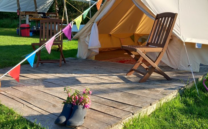 Fancy Sleeping under canvas – The furnished bell tents sleep up to two people in a double bed (plus the option of two air beds for two children but please bring additional bedding and towels just for the children). The Mongolian yurt sleeps up to two adults comfortably in a double bed.