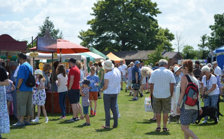 Large village show with main arena, stalls, side shows and a large marquee of exhibits.